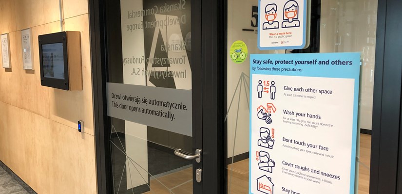 Spółka biurowa Skanska była w stanie dostosować się do nowej rzeczywistości w tak krótkim czasie, głównie dzięki kulturze opartej o elastyczny czas pracy i wcześniej wdrożonych zasadach pracy z domu. Nie byłoby to możliwe bez wykorzystania nowoczesnych narzędzi, które w znacznym stopniu ułatwiają wirtualne spotkania i realizację codziennych zadań. Po blisko trzech miesiącach pracy zdalnej , do biur stopniowo wracają pracownicy dewelopera. Nowe wytyczne i zasady organizacji w miejscach pracy są prezentowane przy użyciu specjalnie zaprojektowanych komunikatów wizualnych, ułatwiających przestrzeganie polityki dystansu społecznego. Są to plakaty i oznaczenia podłogowe z zaleceniami właściwymi dla danej przestrzeni lub pomieszczenia, a także ogólnie obowiązującymi zasadami postępowania. Instrukcje zostały ujednolicone, a do ich produkcji użyto materiałów przyjaznych środowisku.