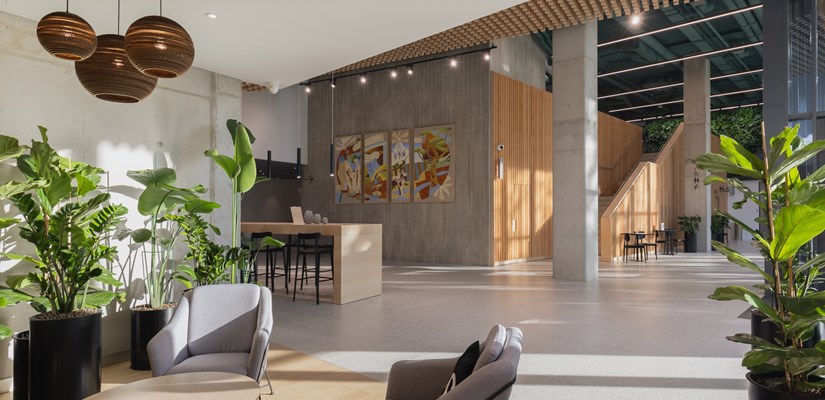 W budynku znajdziemy bioróżnorodną zieleń, między innymi kompozycję roślin na jednej ze ścian w przestrzeni lobby. Części betonowe są równoważone ciepłym, naturalnym drewnem.