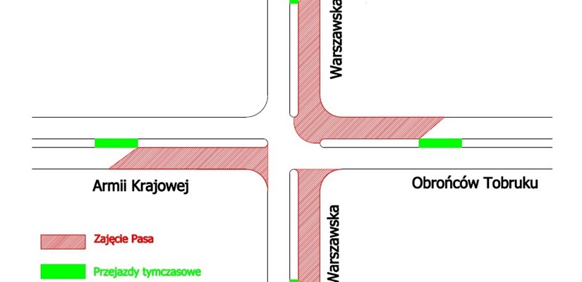 Z rozpoczynającymi się w poniedziałek pracami remontowymi wiązać się będą zmiany w organizacji ruchu, które potrwają od soboty, 21 września do początku zimy. W tę sobotę kierowców czekają chwilowe utrudnienia związane z przygotowaniem oznakowania skrzyżowania do obowiązującej od tego dnia tymczasowej organizacji ruchu. Od godziny 17.00 nastąpi wyłączenie sygnalizacji na skrzyżowaniu, a ruch będzie kierowany przez policję. Prace potrwają do ok. godziny 19.00, kiedy to nastąpi ponowne uruchomienie sygnalizacji świetlnej. Od tego momentu do początku zimy nastąpi zamknięcie odcinka jezdni wzdłuż alei Warszawskiej,.biegnącego w kierunku centrum. Ruch dwukierunkowy zostanie przeniesiony na sąsiadującą jezdnię. W przypadku ul. Obrońców Tobruku zamknięty zostanie prawoskręt w al. Warszawską, a ruch dwukierunkowy odbywać się będzie drugim pasem, podobnie jak w przypadku zamknięcia prawego pasa ruchu ul. Armii Krajowej biegnącego w stronę Obrońców Tobruku.