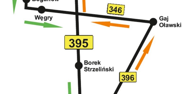 - dla odcinka od skrzyżowania DW 395 z 346 objazd w kierunku Wrocławia wyznaczono od skrzyżowania DW 395 z DW 396 w Strzelinie drogą wojewódzką nr 396 do miejscowości Gaj Oławski i dalej drogą wojewódzką nr 346 do skrzyżowania z DW 395, następnie w prawo do Wrocławia zgodnie z kierunkiem ruchu.