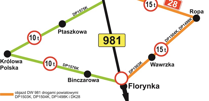 W tym czasie kierowcy pojazdów o masie do 15 t powinni poruszać się objazdem drogami powiatowymi DP1503K, DP1504K, DP1498K oraz drogą krajową 28 przez miejscowości Wawrzka i Ropa.