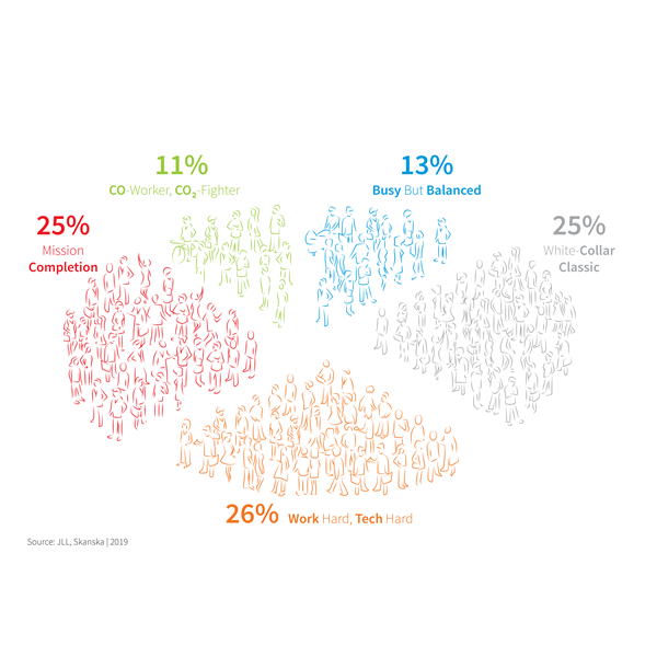 JLL i spółka biurowa Skanska wspólnie przyjrzały się preferencjom pracowników nowoczesnych biur w Polsce. W efekcie wyróżniono pięć osobowości i stylów pracy, które mają różne potrzeby i oczekiwania względem przestrzeni biurowej.